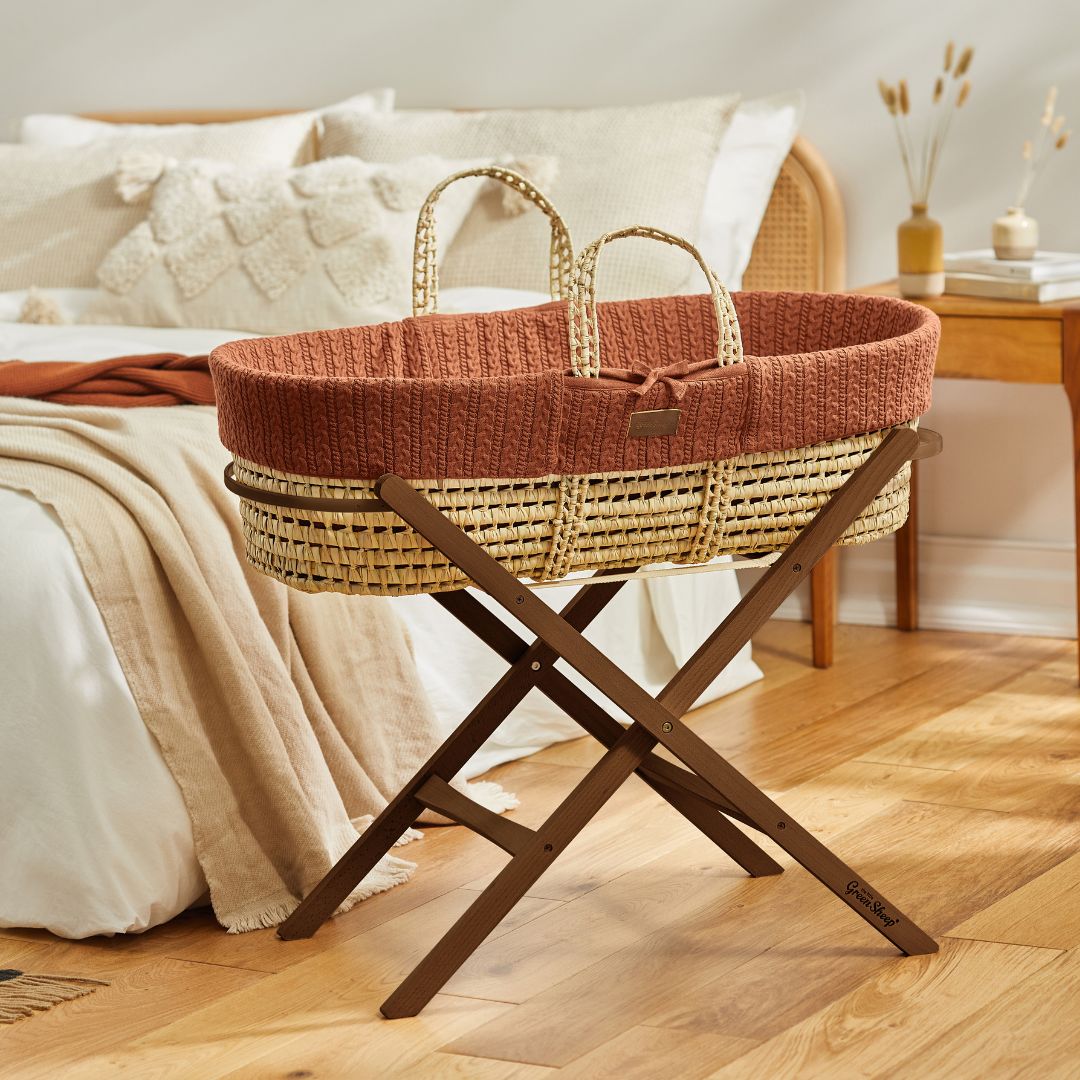 Organic Knitted Moses Basket, Mattress & Walnut Foldable Stand Terracotta