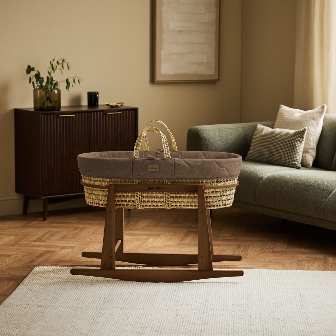 Organic Rice Quilt Moses Basket, Mattress & Walnut Rocking Stand Cocoa with Ebony